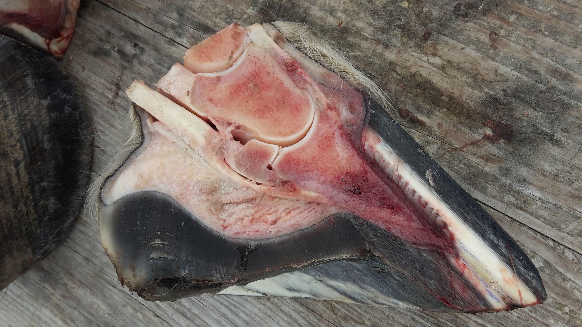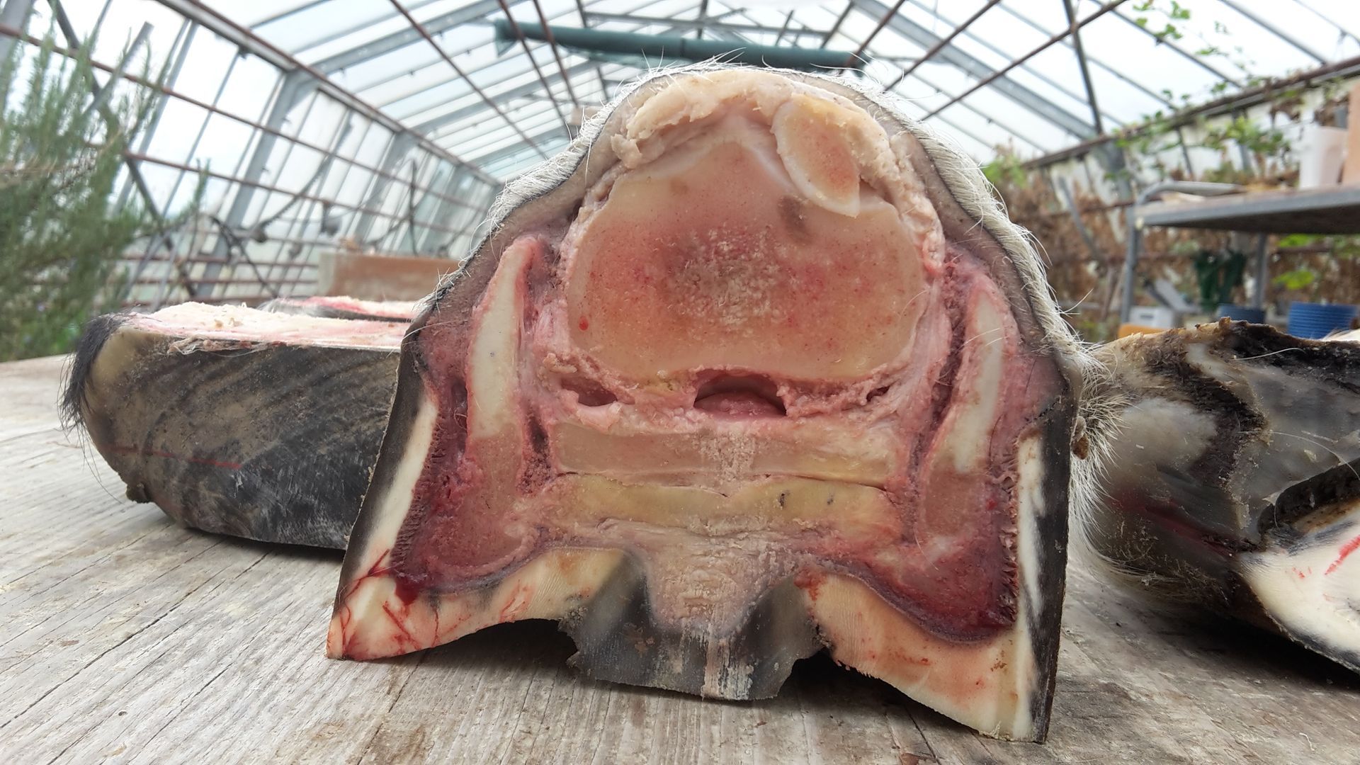 An diesem Schnitt eindeutig erkennbar: Das Hufbein hat am gesunden Huf eine bodenparallele Position
