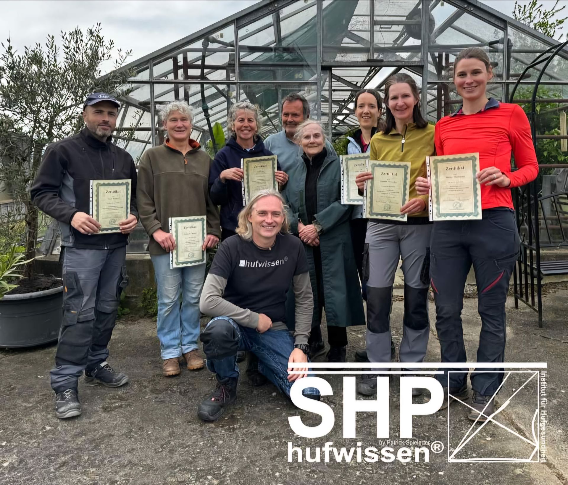 Bestandene Prüfung - Ausbilder Patrick Spieleder - Hufklinik Österreich (vorne), Frau Dr.med.vet. Straßer & Beiprüfer Dr.med.vet. Rügli gratulieren